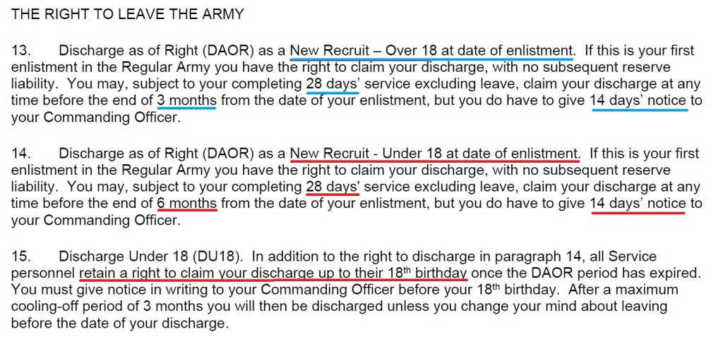 Important: If you want to leave, you MUST hand in your notice during the first six months or by the day before your 18th birthday, whichever is later – otherwise you’ll be locked into the army with no legal right to leave at all for the next FOUR YEARS. There are no exceptions. And after you’ve left you’re still on the reserve list, which means the army can still call you up to train or fight at any time for the next SIX YEARS.